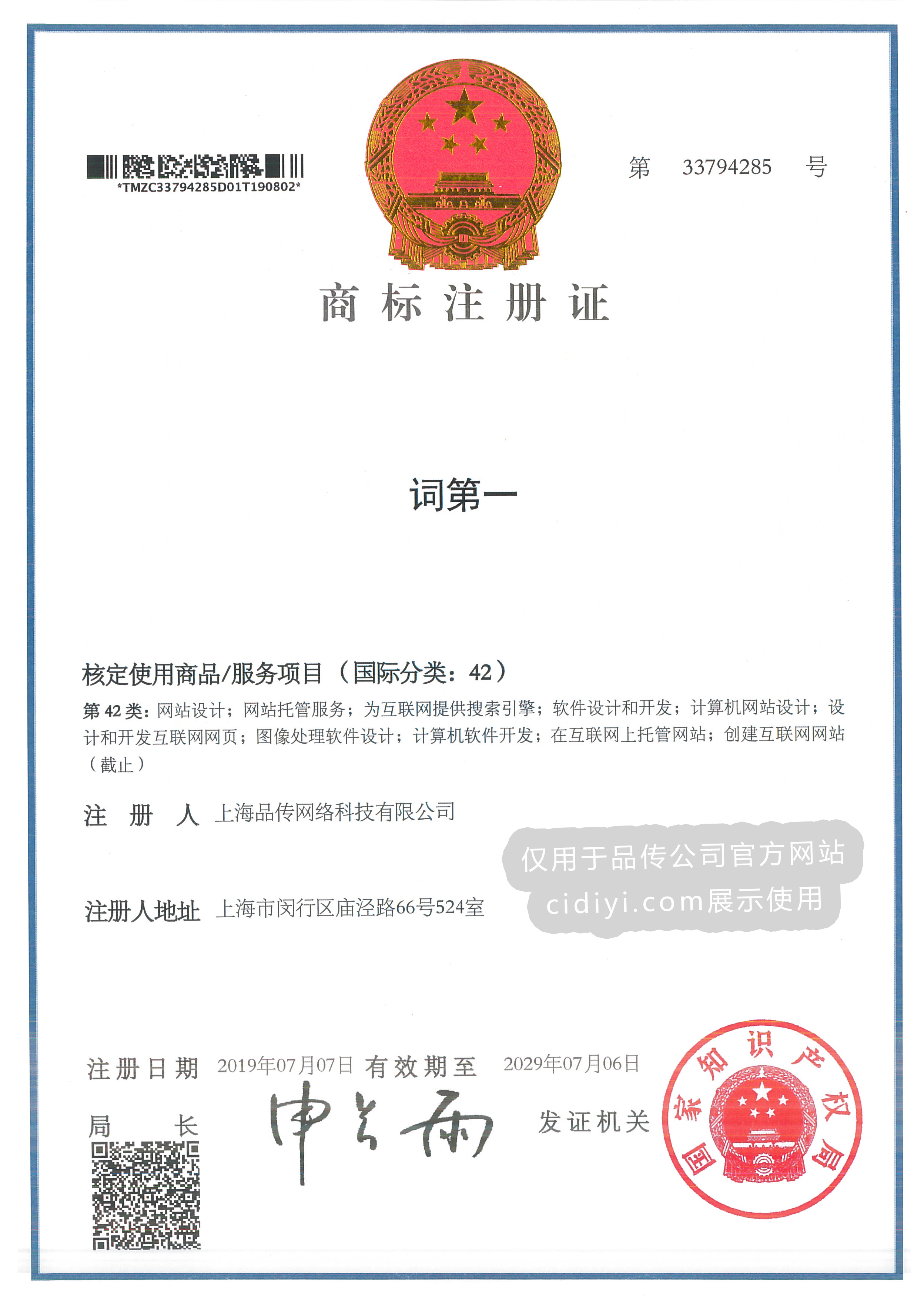 SEO品牌【词第一】商标证书展示
